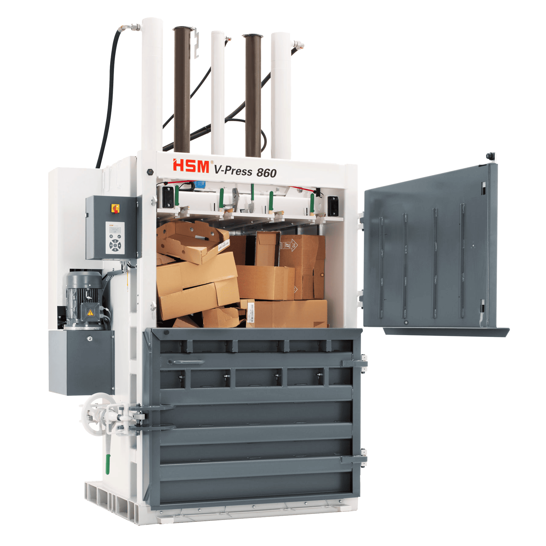 Hydraulisk, stillegående presse for større butikker, sentre og bedrifter. Eller bare for den kresne. Presskraft: 60 tonn. Automatisk åpning av tømmedør. Touch panel hvor man enkelt kan bytte innstillinger, språk m.m. Presser baller på over 400 kg, hvilket ingen andre vertikale presser kan matche. Bortsett fra HSM 1160 … NB! Leveringshøyde kun 214 cm.